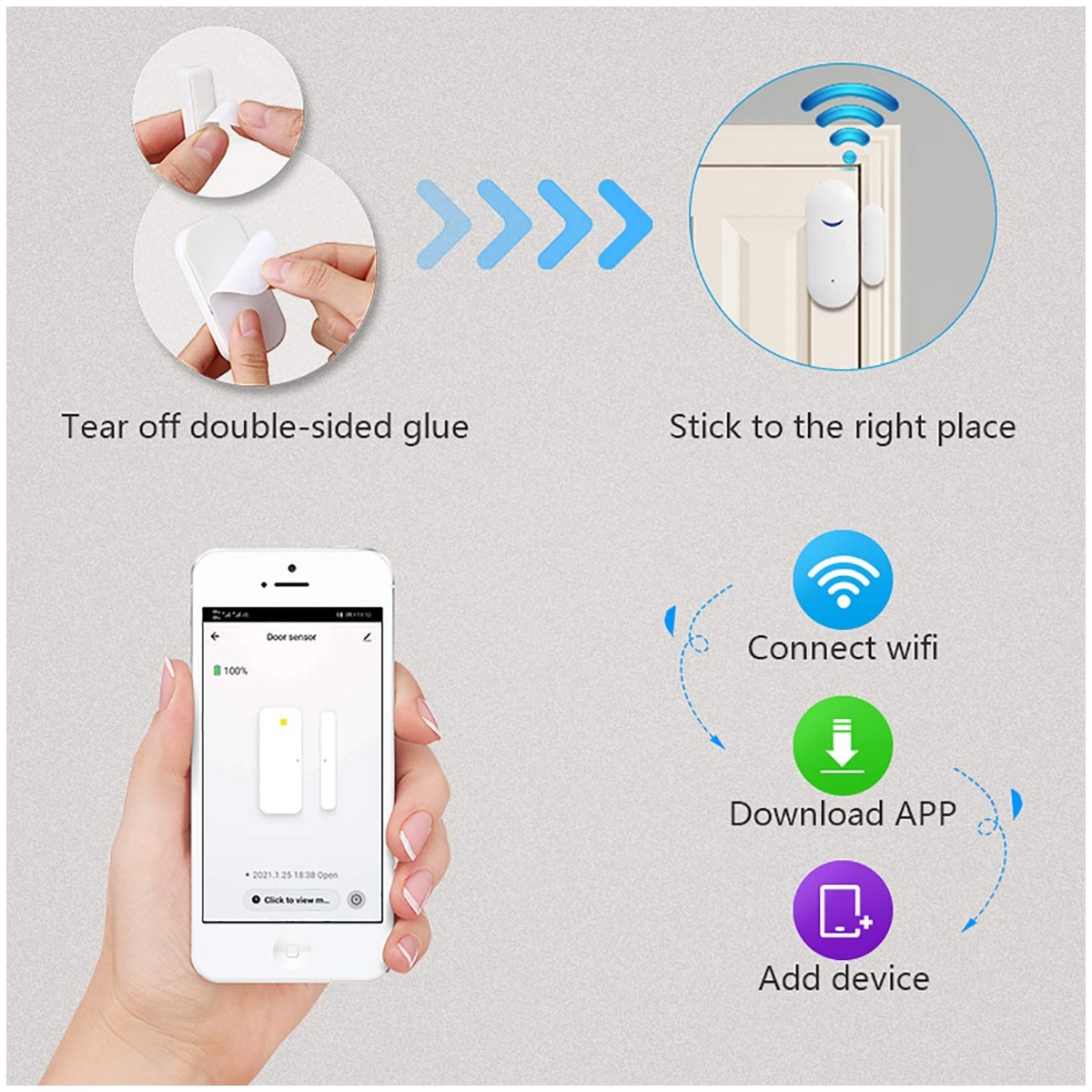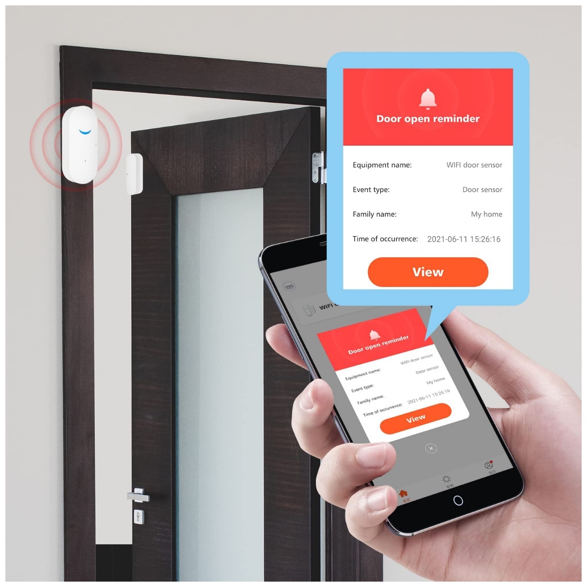 Conexión inalámbrica WiFi, mediante la conexión WiFi al celular, reciba notificación instantánea a tu teléfono cuando la puerta o la ventana se abre o cierra.